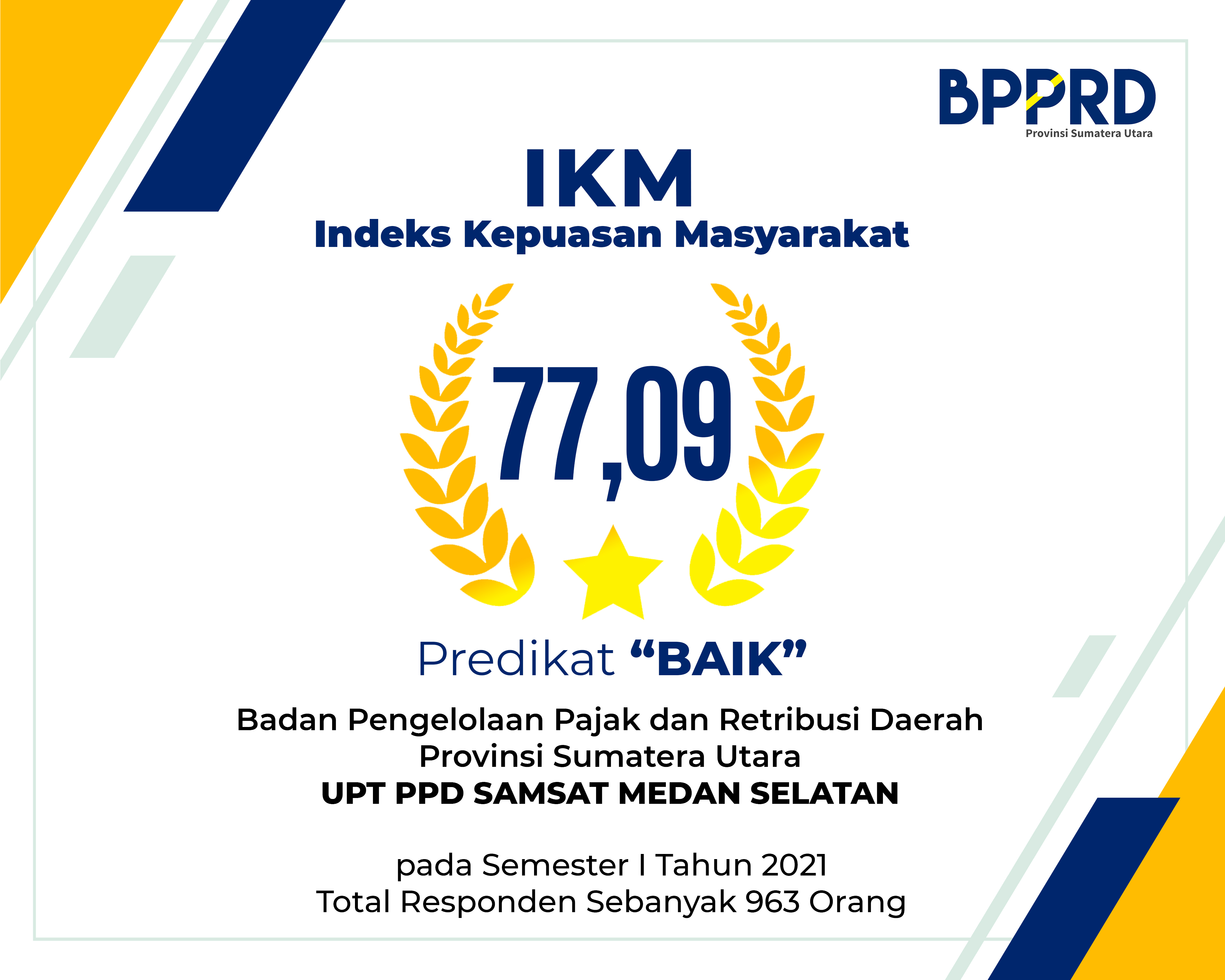Indeks Kepuasan Masyarkat (IKM) terhadap kualitas pelayanan publik di UPT PPD Samsat Medan Selatan mendapat predikat "Baik"